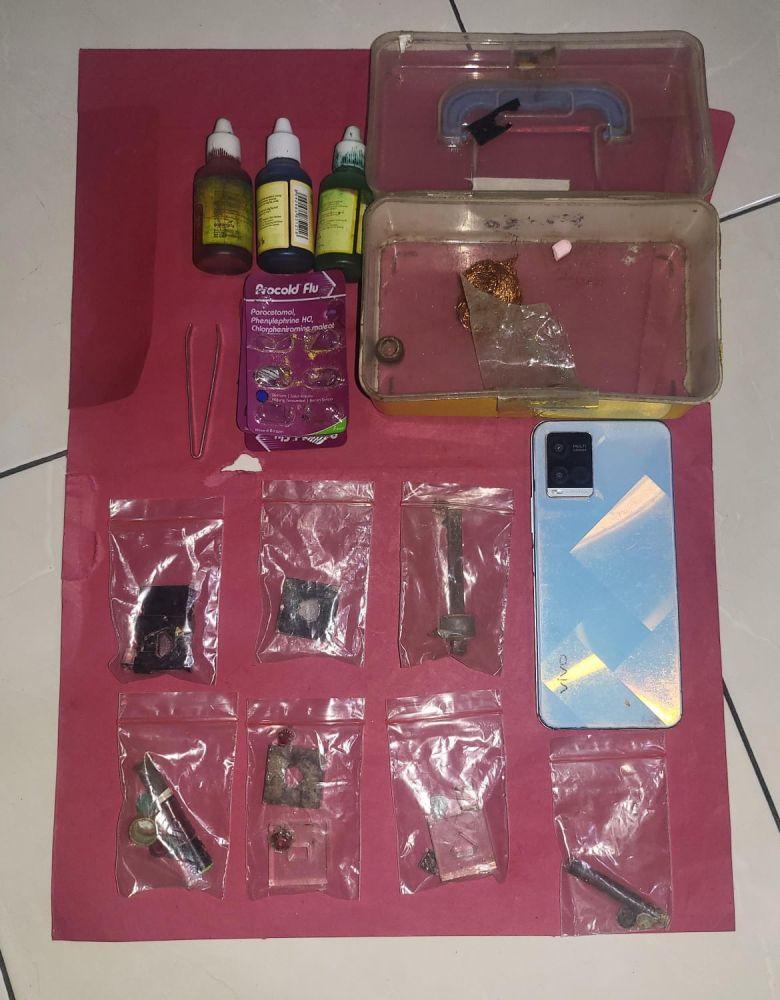 Usai digeledah, polisi mengamankan beberapa alat yang digunakan untuk memproduksi pil ekstasi palsu. Dimana pelaku membuat pil tersebut dari campuran beberapa obat yang biasa digunakan untuk sakit kepala. Selain itu ditemukan juga 24 pil ekstasi yang sudah jadi.