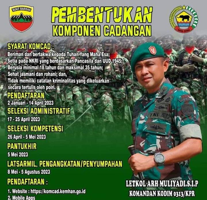 riauraya.tv - Kementerian Pertahanan Republik Indonesia membuka peluang perekrutan atau pembentukan Komponen Cadangan (Komcad) Matra Darat Tahun 2023 yang pembukaannya sudah dimulai pada tanggal 02 Januari 2023 lalu.