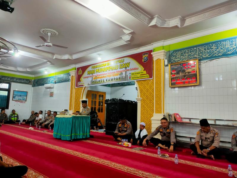 RiauRaya.tv - Polres Kampar menggelar kegiatan memperingati kisah perjalanan nabi Rasulullah SAW dari masjid Haram ke masjid Aqsa yakni Isra dan Mikraj, di Masjid Al-Ikhlas, Kelurahan Langini, Kecamatan Bangkinang Kota, Kabupaten Kampar, Rabu (22/02/2023) pagi ini.