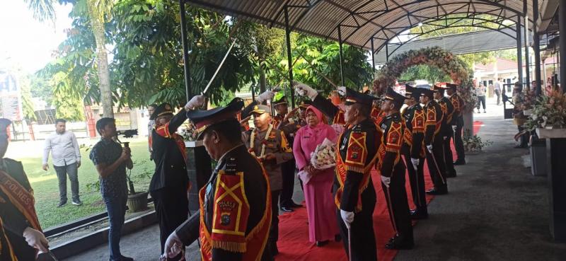 Penyambutan Kapolres Kampar AKBP Ronal Sumaja dan Ketua Bhayangkari Cabang Kampar ini diawali dengan pengalungan bunga oleh AKBP Didik Priyo Sambodo dan Ny Pipin.