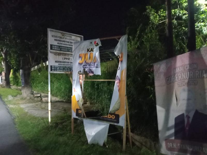Dari pantauan awak media di keseluruhan tempat, terutama di Kota Bangkinang, hampir keseluruhan APK Repol-Ardo yang bergambar bersama Ustadz Abdul Somad (UAS) telah dirusak OTK.(*)