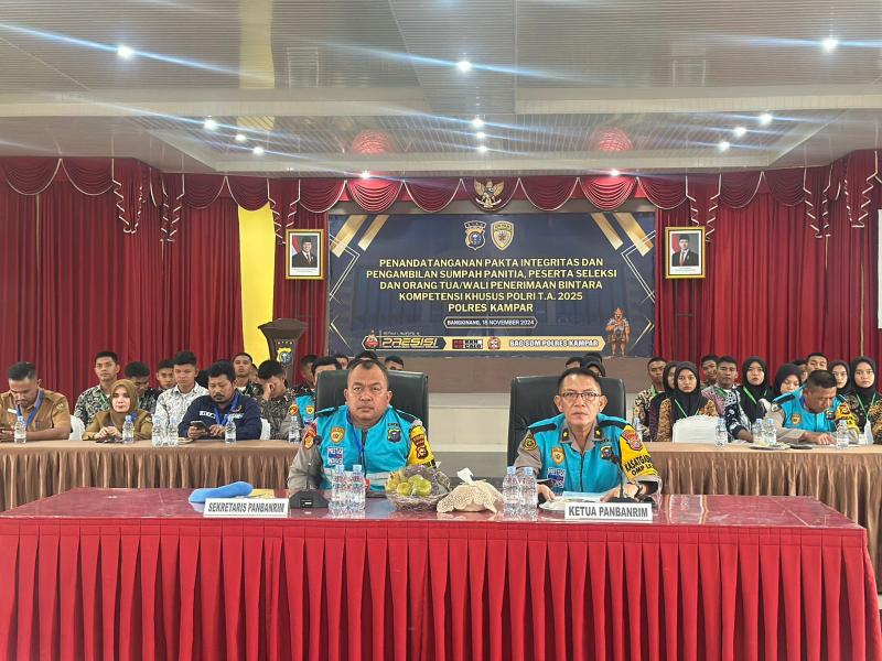 Saat ini, Polres Kampar sudah mempersiapkan segala sesuatu untuk pelaksanaan kegiatan penandatangan pakta integritas dan pengambilan sumpah panitia, orang tua/wali dan peserta pada penerimaan Bakomsus Polri TA 2025.