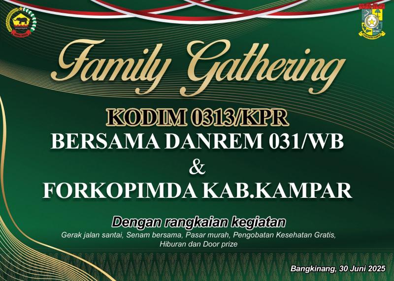 BANGKINANG KOTA (RRTV) - Kodim 0313/KPR menggelar kegiatan Family Gathering dengan menghadirkan Danrem 031/Wira Bima Pekanbaru dan Forum Koordinasi Pimpinan Daerah (Forkopimda) Kabupaten Kampar pada hari Senin (30/06/2025) besok pagi.