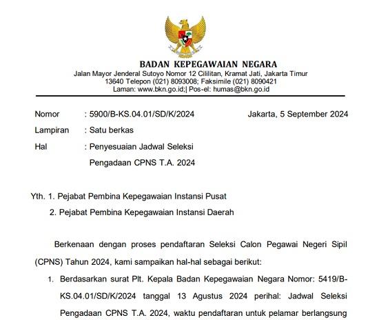 "Untuk memberikan kesempatan yang lebih luas kepada masyarakat, bersama ini kami sampaikan penyesuaian jadwal Seleksi Pengadaan Calon Pegawai Negeri Sipil (CPNS) TA (tahun anggaran) 2024 sebagaimana terlampir," Kata Plt Kepala BKN Haryomo Dwiputranto dalam keterangan tertulis dikutip, Kamis (5/9/2024).