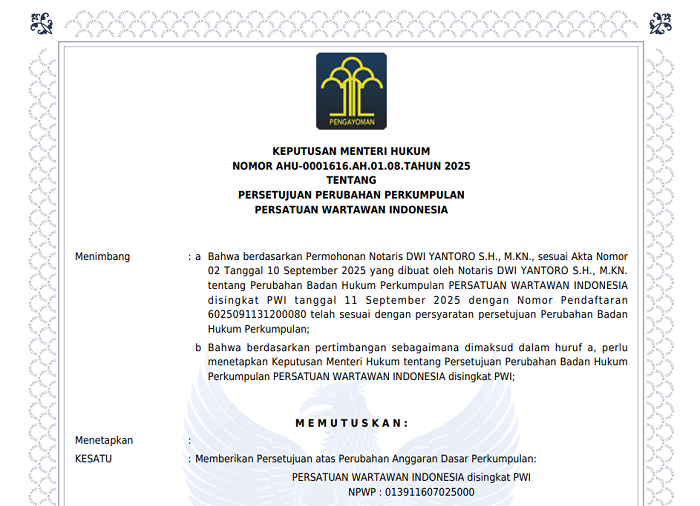 JAKARTA (RRTV) - Organisasi Persatuan Wartawan Indonesia (PWI) resmi kembali terdaftar di Kementerian Hukum (Kemenkum) RI dengan Nomor AHU-0001616.AH.01.08. Tahun 2025.