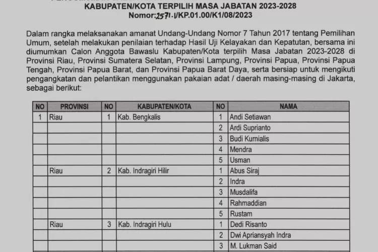 Keputusan ini mengumumkan para pemimpin Bawaslu Kabupaten dan Kota yang akan bertugas dalam periode 2023-2028 oleh Bawaslu RI.