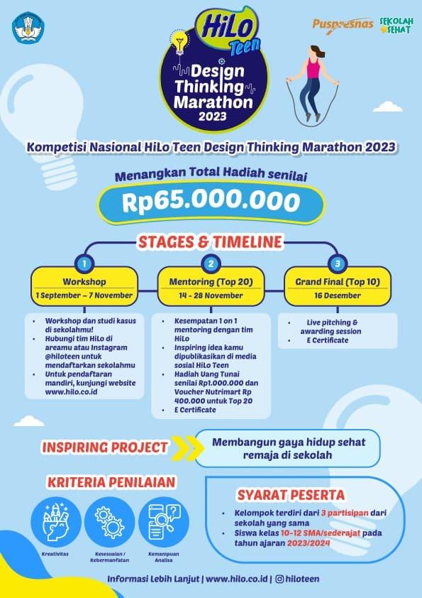riauraya.tv - HiLo Teen, susu berprotein yang tinggi kalsium, lebih rendah lemak, dengan 12 vitamin dan 5 mineral untuk tumbuh ke atas, kembali mengadakan HiLo Teen Design Thinking Marathon 2023, sebuah kompetisi design thinking bagi pelajar tingkat SMA dan sederajat di Indonesia, dengan hadiah total senilai hingga Rp 65.000.000,-. Senin (11/9/2023).