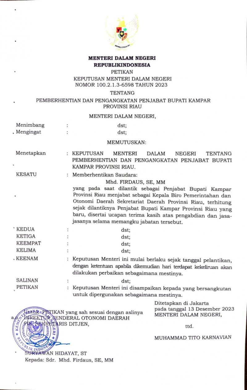 Isi dalam Surat Keputusan tersebut yakni memberhentikan saudara H Mhd Firdaus dengan hormat dari jabatan Penjabat Bupati Kampar dan menunjuk saudara H Hambali yang menjabat Sekretaris Daerah Kabupaten Kampar menjadi Penjabat Bupati Kampar.