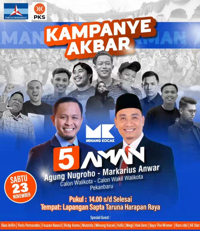 riauraya.tv — Pasangan calon Walikota dan Wakil Walikota Pekanbaru nomor urut 5 Agung Nugroho-Markarius Anwar (AMAN) bakal menggelar kampanye akbar jelang masa tenang pada Pilkada Pekanbaru 2024.