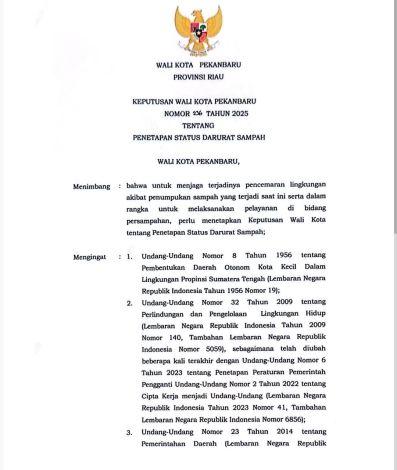 Penjabat (Pj) Wali Kota Pekanbaru, Roni Rakhmat, menetapkan status darurat sampah sesuai dengan Surat Keputusan (SK) Wali Kota Pekanbaru Nomor 236 Tahun 2025 yang berlaku selama 7 hari mulai tanggal 15 hingga 21 Januari 2025 mendatang.