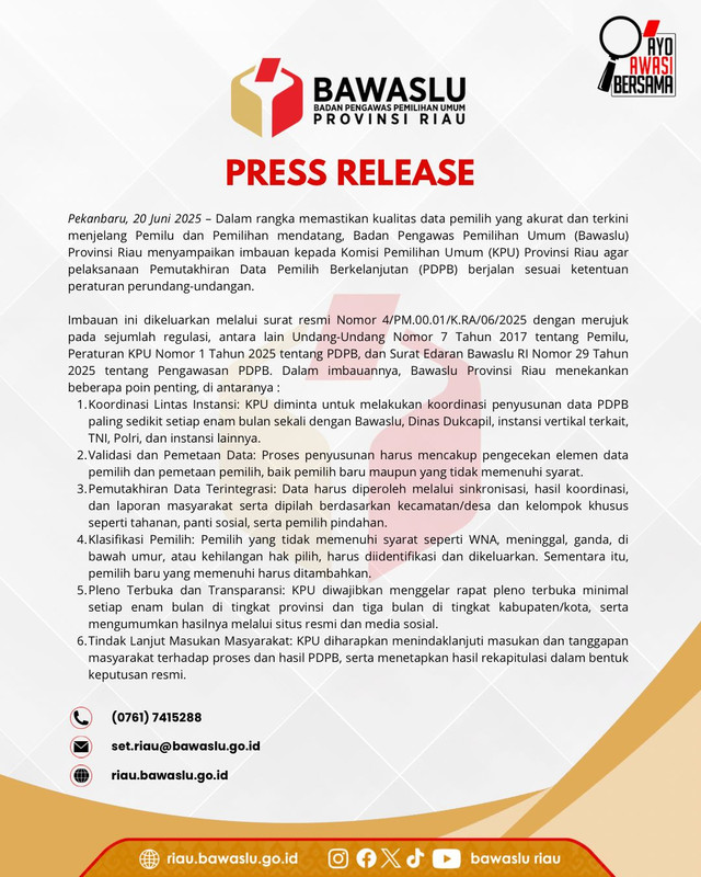 Imbauan tersebut disampaikan secara resmi melalui surat bernomor 4/PM.00.01/K.RA/06/2025. Bawaslu Riau merujuk pada sejumlah regulasi penting, seperti Undang-Undang Nomor 7 Tahun 2017 tentang Pemilu, Peraturan KPU Nomor 1 Tahun 2025 tentang PDPB, serta Surat Edaran Bawaslu RI Nomor 29 Tahun 2025 mengenai pengawasan terhadap proses PDPB.