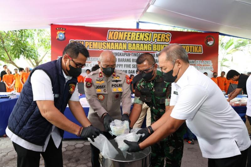 Direktur Reserse Narkoba Polda Riau, Kombes Pol Putu Yudha Prawira, merinci barang bukti yang dimusnahkan 121,52 kilogram sabu, 4.592 butir ekstasi, 647 butir happy five. Kemudian, 257,8 gram heroin, 34,85 gram ketamin dan 624 cartridge vape liquid.