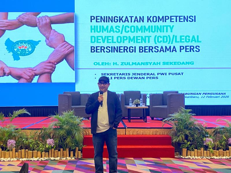 PEKANBARU (RRTV) - Sekretaris Jenderal Persatuan Wartawan Indonesia (PWI) Pusat, H Zulmansyah Sekedang tampil sebagai narasumber dalam kegiatan kegiatan Peningkatan Kompetensi Humas/Community Development/Legal dalam Sinergi dengan Media, Motivasi Kerja, dan Public Speaking di The Zuri Hotel Pekanbaru, Kamis (12/2/2026).