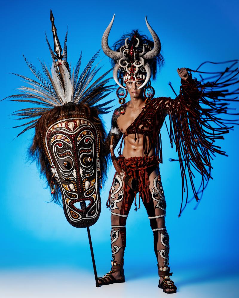 Kostum nasional ini 60% terbuat dari bahan daur ulang dan terinspirasi dari warisan budaya kaya masyarakat Asmat di Papua, mencerminkan seni yang rumit, hubungan spiritual dengan alam, dan semangat kepahlawanan. Tanduk pada kostum melambangkan kekuatan dan perlindungan, mencerminkan peran masyarakat Asmat sebagai penjaga tanah leluhur mereka.